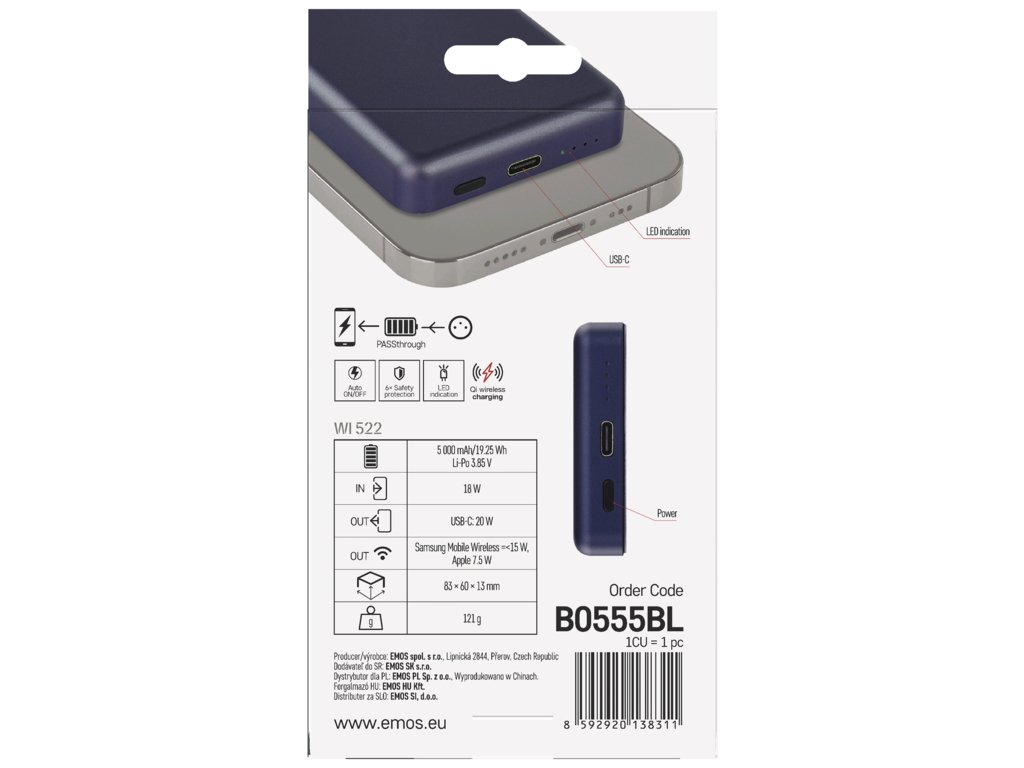 EMOS POWERBANKA WI 522, bezdrátové nabíjení 20W, 5.000mAh, MODRÁ, 1xUSB-C