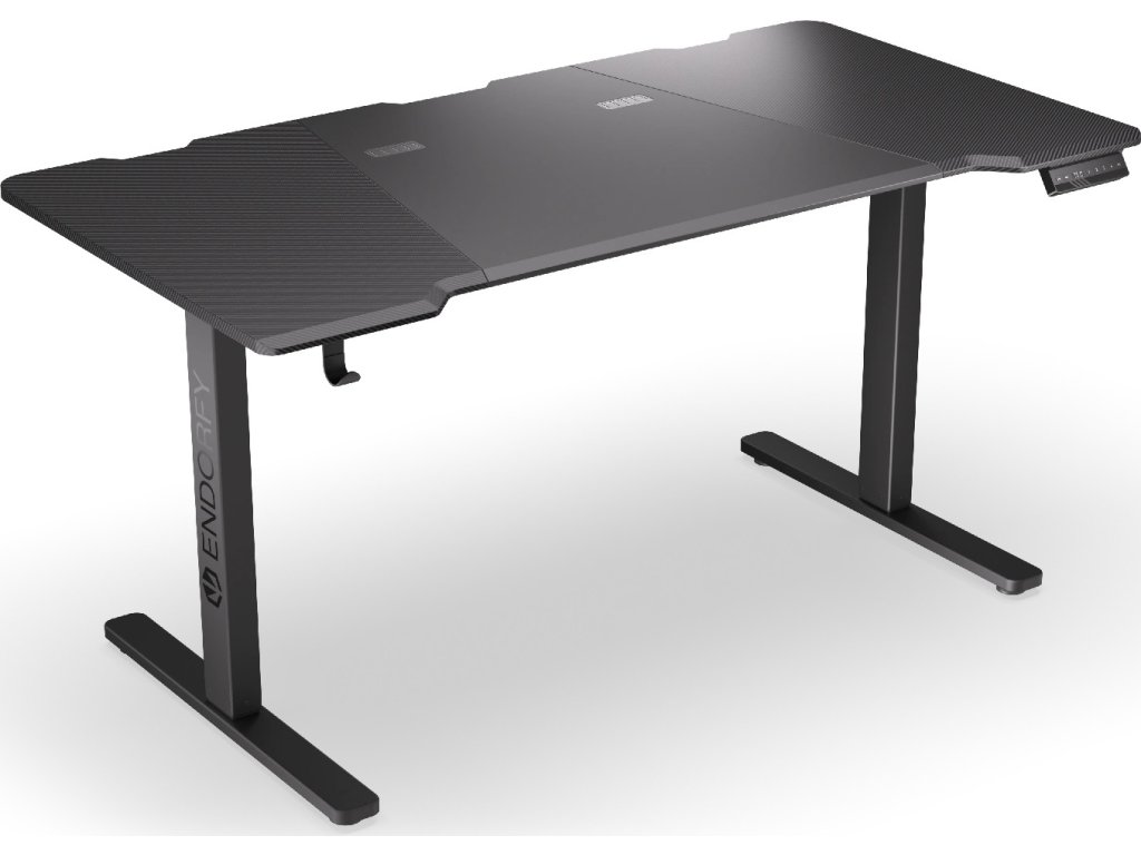 Herní stůl o délce 150 cm a šířce 78 cm nabízí dostatek prostoru pro myš, klávesnici a další příslušenství. Výšku lze plynule nastavit v rozsahu 73 až 120 cm pouhým stisknutím tlačítka na ovládacím panelu, který navíc umožňuje uložit až čtyři nastavení výšky. Na spodní straně desky je umístěn systém pro správu kabelů. Maximální stabilitu zajišťuje robustní ocelová konstrukce s nosností až 80 kg. Povrchová úprava desky stolu ve stylu uhlíkových vláken nejen dobře vypadá, ale je také odolná proti poškrábání. V neposlední řadě zajisté potěší kovová polička pro napájecí lištu na zadní straně a háček pro zavěšení sluchátek.