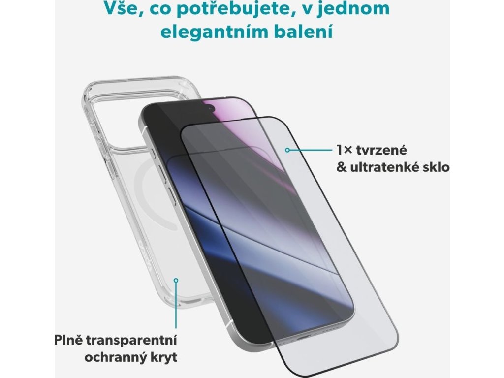 Průhledná zadní strana krytu s UV ochranou zabraňuje zežloutnutí a zachovává původní vzhled iPhonu. Ochranné sklo kryje displej od kraje ke kraji a s tloušťkou 0,33 mm v kombinaci s tvrdostí 9H ho spolehlivě chrání, aniž by snižovalo citlivost dotyku nebo ostrost obrazu. Speciální vrstva proti otiskům prstů zároveň udržuje povrch displeje čistý a bez šmouh. Štíhlé provedení krytu a hladké 2,5D hrany skla zaručují, že váš iPhone působí elegantně a příjemně padne do ruky. Pružný rámeček krytu a jednokrokový aplikátor skla usnadňují instalaci, takže vše zvládnete rychle a snadno.