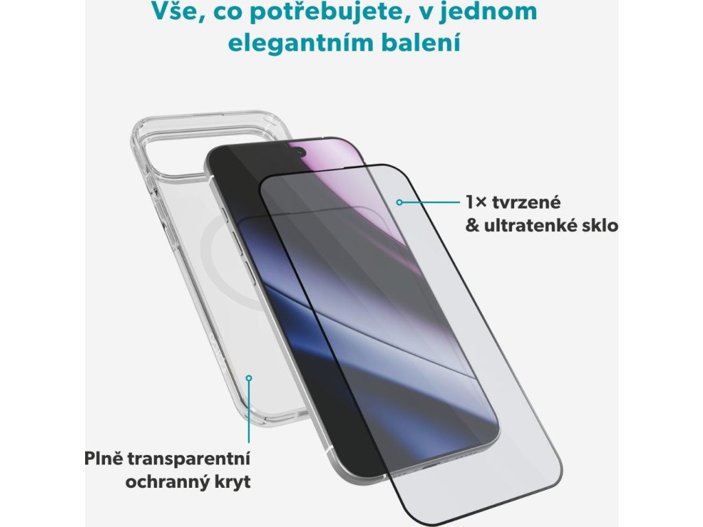 Průhledná zadní strana krytu s UV ochranou zabraňuje zežloutnutí a zachovává původní vzhled iPhonu. Ochranné sklo kryje displej od kraje ke kraji a s tloušťkou 0,33 mm v kombinaci s tvrdostí 9H ho spolehlivě chrání, aniž by snižovalo citlivost dotyku nebo ostrost obrazu. Speciální vrstva proti otiskům prstů zároveň udržuje povrch displeje čistý a bez šmouh. Štíhlé provedení krytu a hladké 2,5D hrany skla zaručují, že váš iPhone působí elegantně a příjemně padne do ruky. Pružný rámeček krytu a jednokrokový aplikátor skla usnadňují instalaci, takže vše zvládnete rychle a snadno.