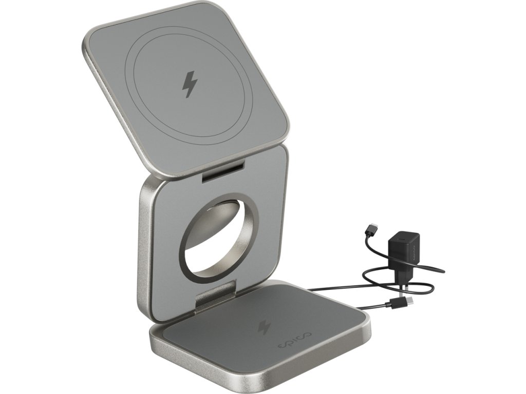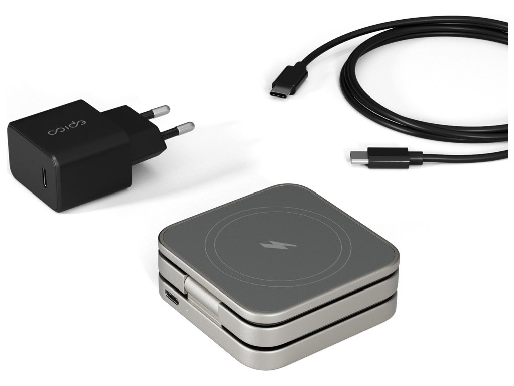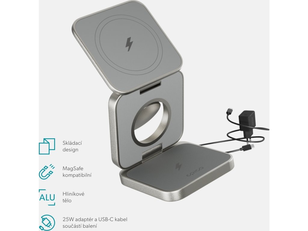 Cestovní skládací nabíječka pro všechna vaše zařízení Kompatibilita MagSafe a Qi2: Bezproblémové bezdrátové nabíjení s bezpečným magnetickým uchycením.15W bezdrátový výstup: Poskytuje až 15W bezdrátové nabíjení pro kompatibilní smartphony a 7,5W pro iPhony. 3v1 nabíjení: Umožňuje současné nabíjení smartphonu, Apple Watch (2,5W) a AirPods (5W). Hliníkové tělo: Prémiové a odolné hliníkové tělo zabraňuje přehřívání. Kompaktní design: Po složení zabere minimum místa, takže ji snadno vezmete kamkoli s sebou. Stabilní silikonová základna s protiskluzovou silikonovou základnou. Flexibilní umístění: Podporuje umístění smartphonu na výšku i na šířku.