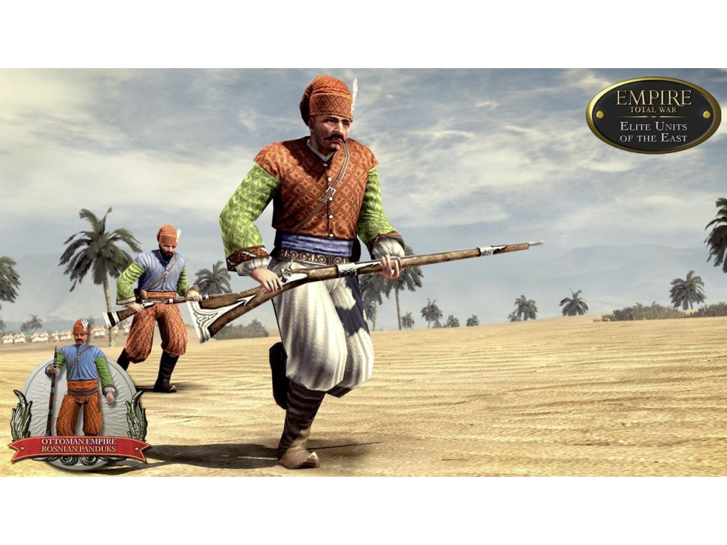 Balíček Elitní jednotky východu pro hruEmpire: Total War™ přidává Marathské a Osmanské straně 12 nových elitních jednotek. Empire: Total War expanduje dále navýchod. Tento balíček pro hru Total Warobsahuje nejlepší jednotky z východníchzemí. Většina schopností těchto vojáků se rozvinula na bitevním poli – někteří jsou obávaní zbojníci, jiní pocházejí zesilného akademického prostředí, které jenaučilo válečnému umění. Nabídnou širokou řadu taktických možností, které budounepřátelům nahánět strach.