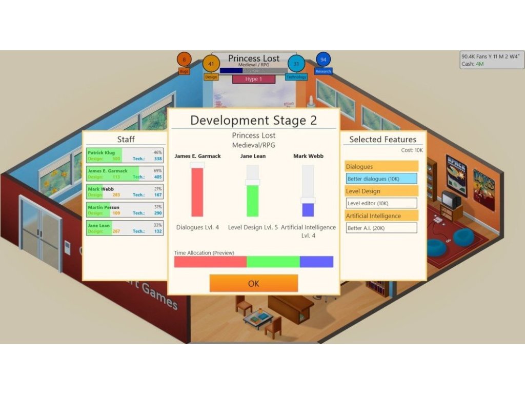 Na začátku hry si založíte svoji postavua společnost. Příliš peněz na účtu zatím nemáte, takže vám nezbývá nic jiného,než se pustit do vývoje vlastní hry. Během vývoje hry si volíte parametry, podlekterých se hra může (ale také nemusí) stát úspěšná - herní platforma, druh grafiky, zvuku, váš vlastní engine pro lepšítechnologie a poměry například level designu, AI, vizualizace..., které určují,na co se má váš herní vývojář více zaměřit (také za to dostává zkušenostní body). To vše vás ale stojí nemalé peníze, proto musíte každý krok dobře promýšlet.