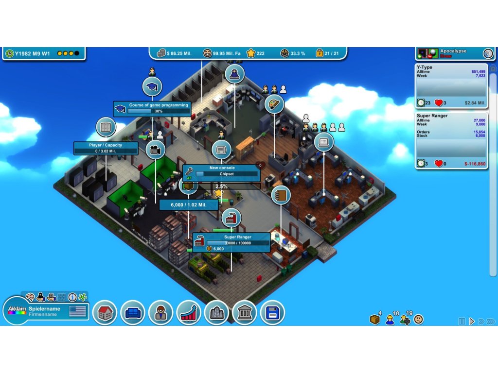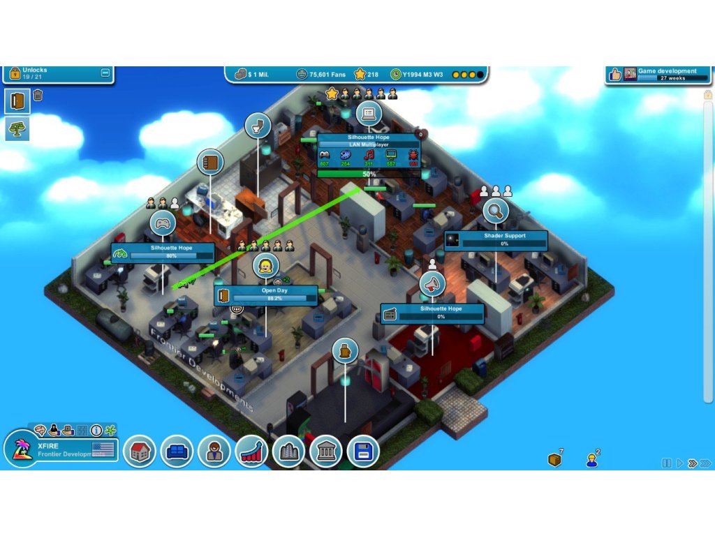Výzkum nových technologií, modernizace kanceláří, přesun do větších a lepších míst. Rozšiřte své podnikání a ovládněte světový trh s videohrami! Vyvíjejte nebokupte někoho jiného herní engine.