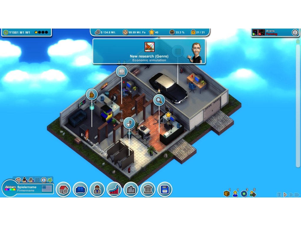 Vytvořte si vlastní studio začátkem osmdesátých let začínající v malé garáži vehře Mad Games Tycoon. Vytvořte si vlastní herní koncepty, vytvořte tým a vyvíjejte megahitové videohry.