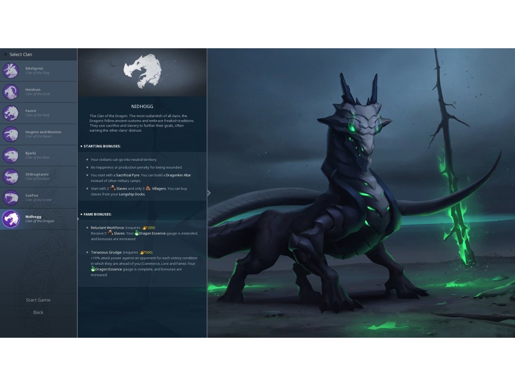 Vaši vesničané mohou být v neutrálnímúzemí. Štěstí a produkce se nezhoršují vdůsledku zranění. Začínáte s obětní pohřební hranicí. Můžete postavit Oltář dračího rodu místo jiné vojenské budovy. Začínáte se 2 otroky. Otrokům můžete kupovat kliknutím na lodní dok. Otroctví, obětní obřady a Dračí esence