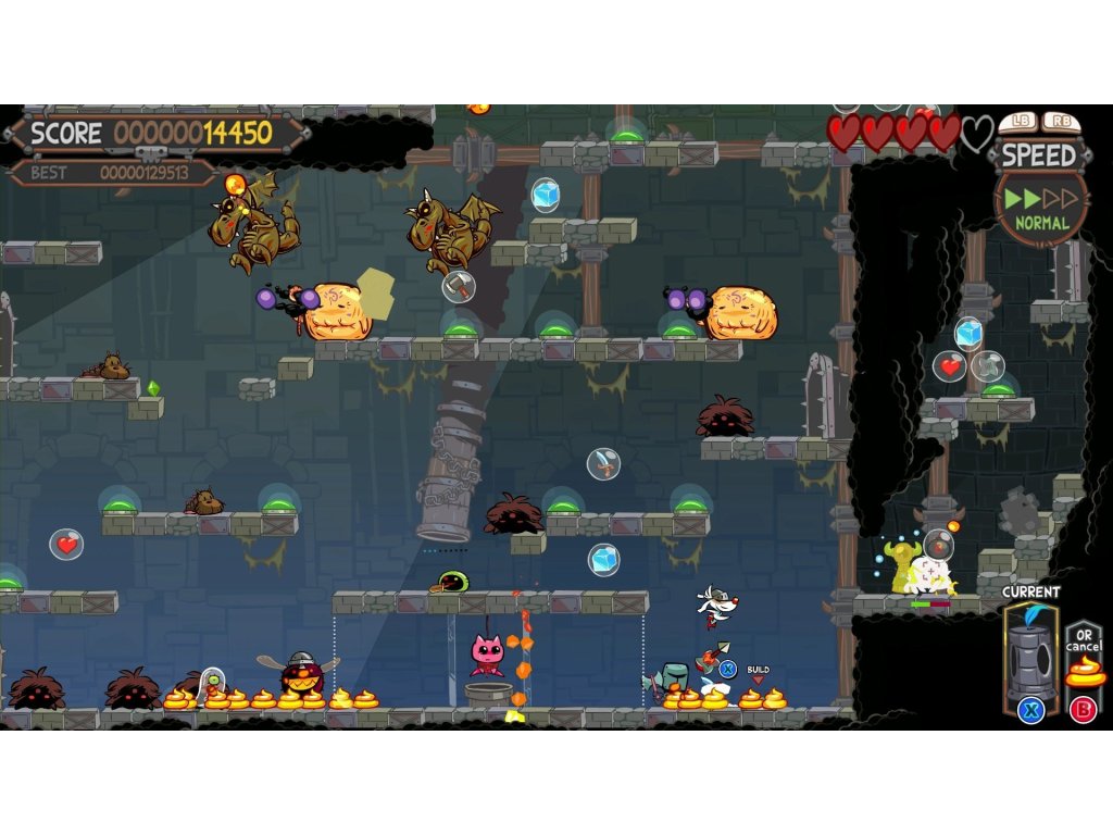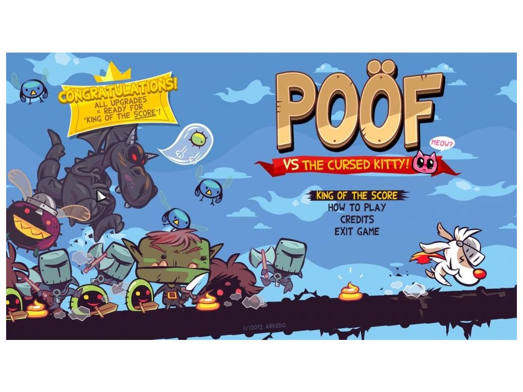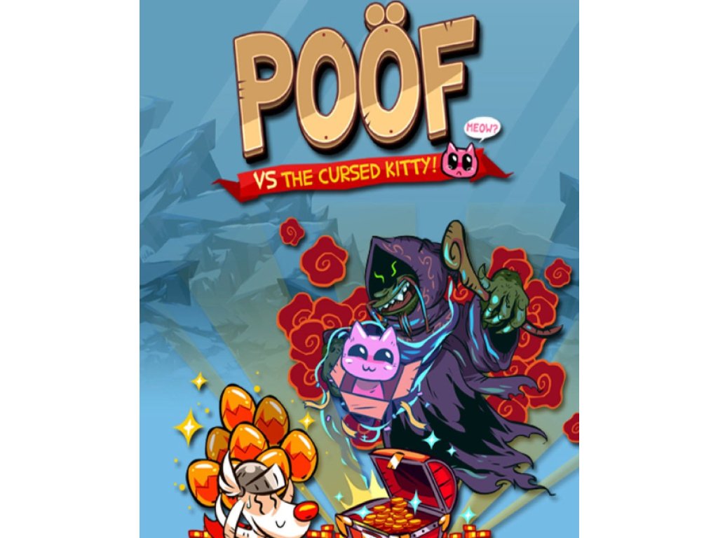 Poöf byl oklamán, aby přijal zlaté ležící kotě. Ale miloučké kotě způsobilo, žese na něj vrhly všechny chamtivé příšery. Odrazte vlny příšer pokoušejících se ukrást vaši kořist! Poöf vs the CursedKitty je kombinace mezi tower defense hrou a akční plošinovkou, hra orientovanána hardcore hráče, přesné ovládání a volby, inspirovaná hrami jako Mario Bros Arcade Game, Orcs Must Die a Super Crate Box. Abyste se zbavili nepřátel, prostěna ně skočte nebo rozmístěte útočné věže, hovínkami je zpomalíte, používejte ohnivé nože nebo bomby, zmrazte je ledovýmvětrem nebo rozpoutejte Armageddon zlatými vajíčky! Také můžete ovládat čas: zpomalte ho v nebezpečných situacích a zrychlete ho pro zvýšení obtížnosti. Jak rychle dokážete hrát? Hardcore hra s exponenciálně vzrůstající obtížností. Originální grafika a středověká atmosférickáhudba. 108 misí, jejichž splněním se vámodemknou vylepšení. 36 vylepšení - schopnosti, zbraně, nepřátele a spousta dalšího. 12 unikátních nepřátel - včetně zlobrů, duchů, draků, psů a dokonce i obřích much. 10 náhodných sběratelských předmětů pro úpravy - pozadí, hudba a kostýmypro Poöf a kotě. Odemkněte si žebříčkya soutěžte s celým světem. Podporuje USBgamepady.