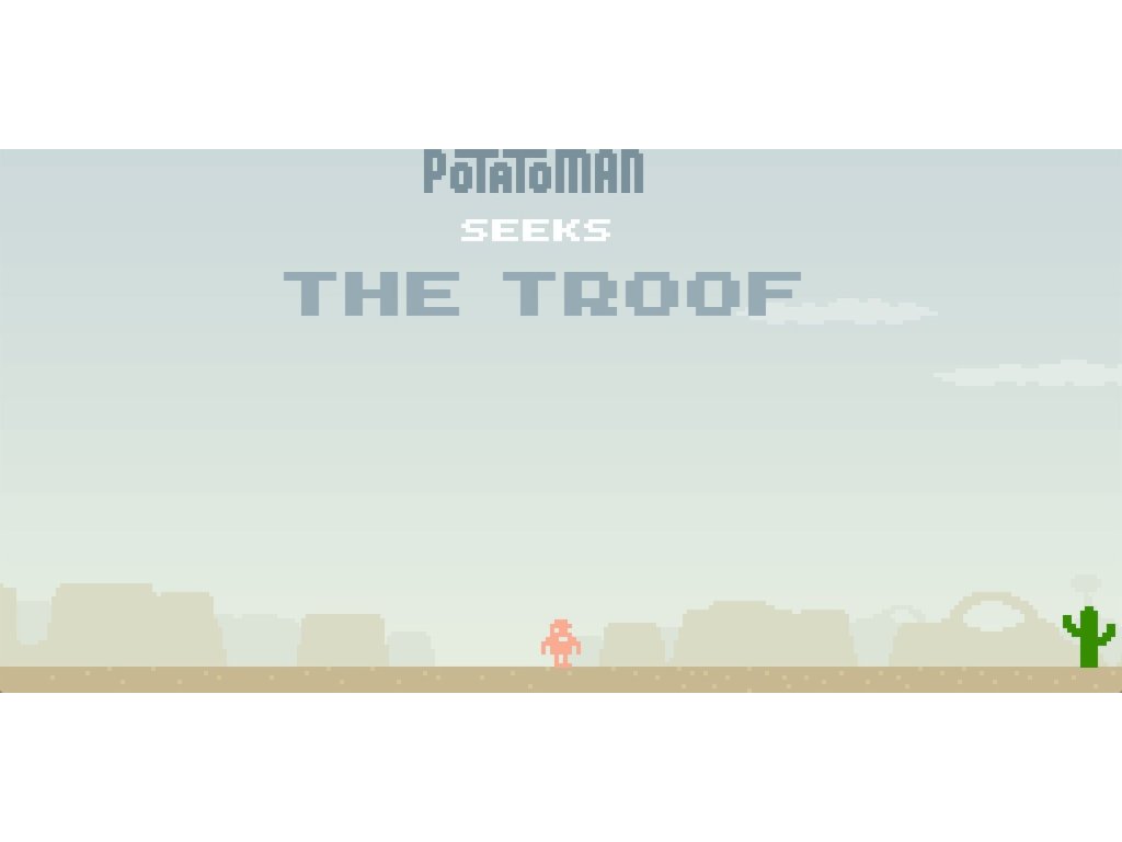 Potatoman otestuje vaše reflexy a pohledna svět, když cestujete po spálených pouštích, temných lesích, rušných městech,nejvyšších horách a nakonec své vlastnívědomí brambor při hledání konečné odpovědi. Jste připraveni čelit TROOF?