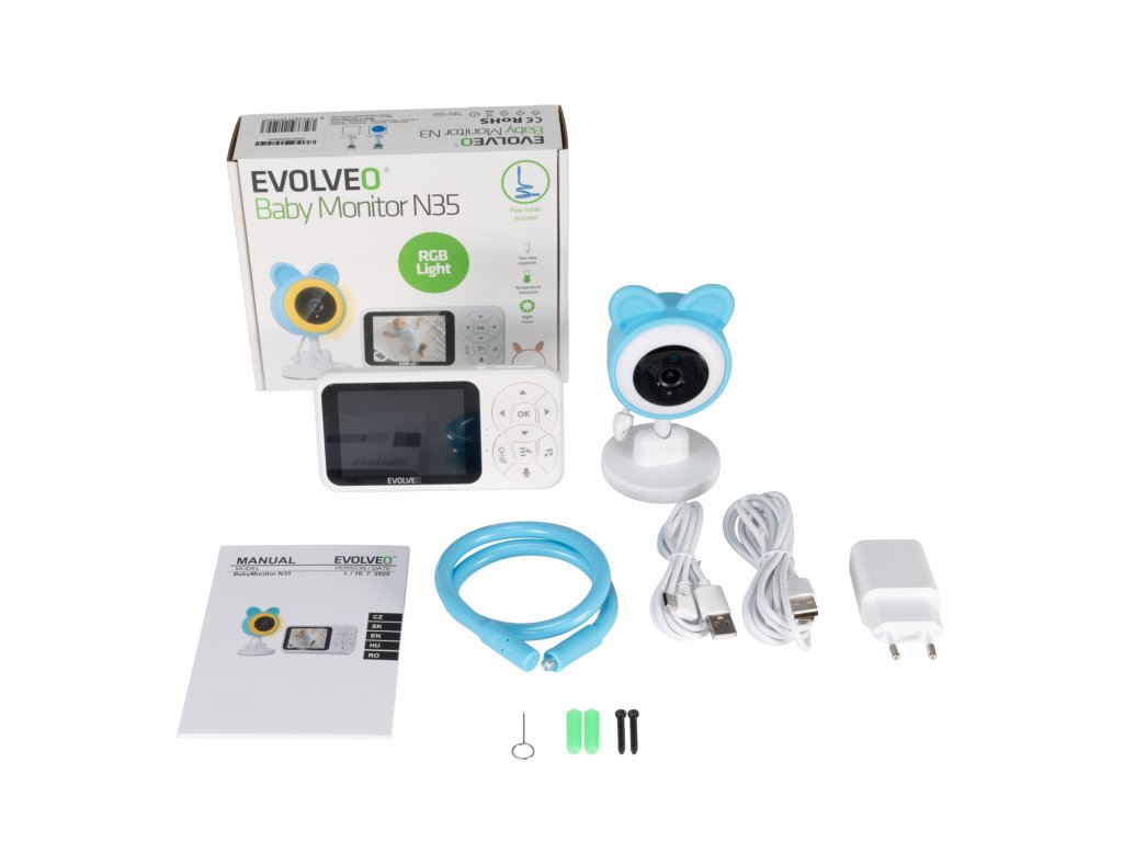 EVOLVEO Baby Monitor N35 – dětská chůvička s kamerou, VOX, teploměr, noční vidění, RGB světlo Modrá