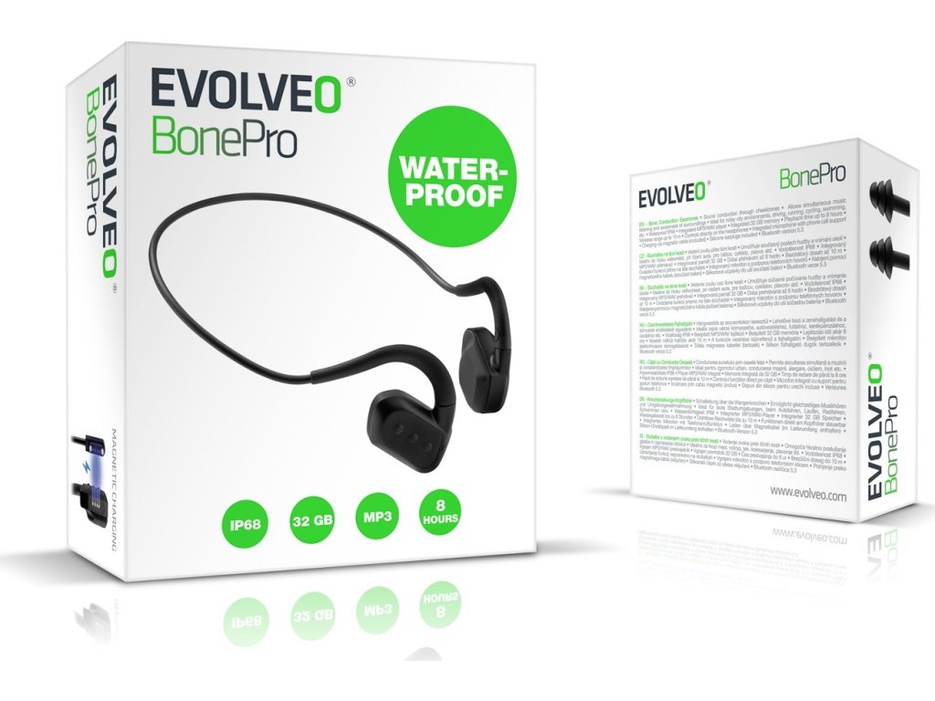 • Ideální volbou jsou pro sportovce – ať už běháte po parku, jedete na kole do práce, nebo se věnujete vodním radovánkám, EVOLVEO BonePro vám umožní slyšet okolní svět i oblíbenou muziku zároveň.