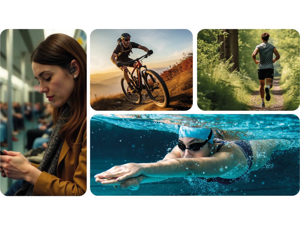 • Revoluční zvuková technologie Bone Conduction s přenosem zvuku přes lícní kosti do vnitřního ucha umožňující poslech hudby a současné vnímání okolí