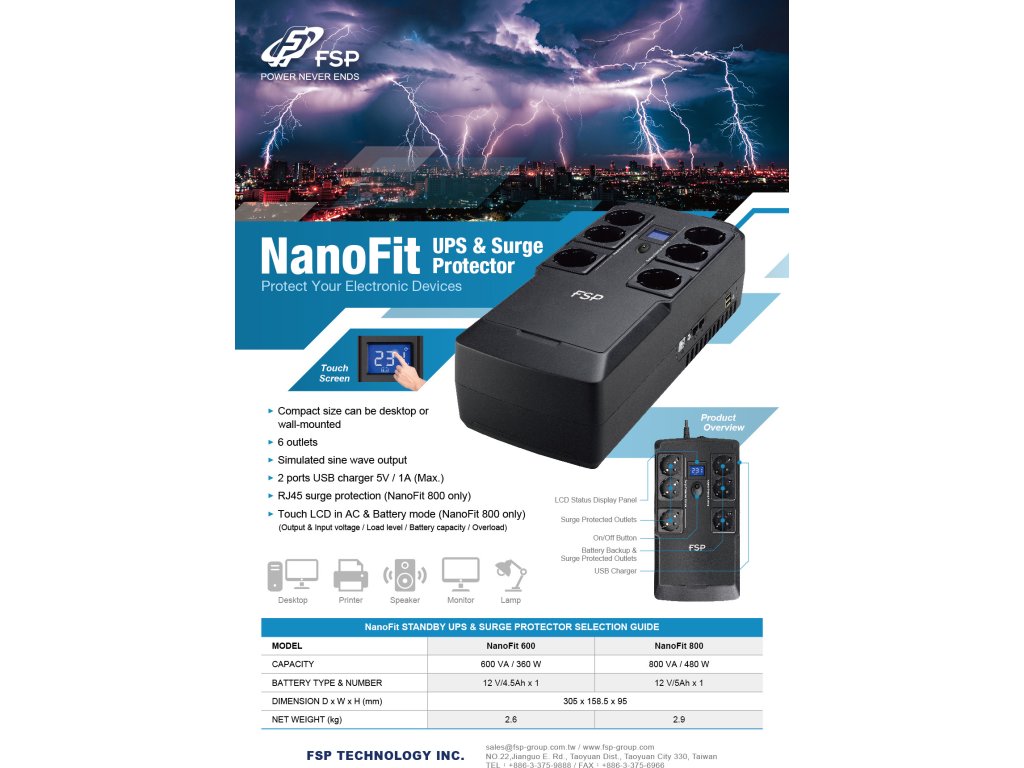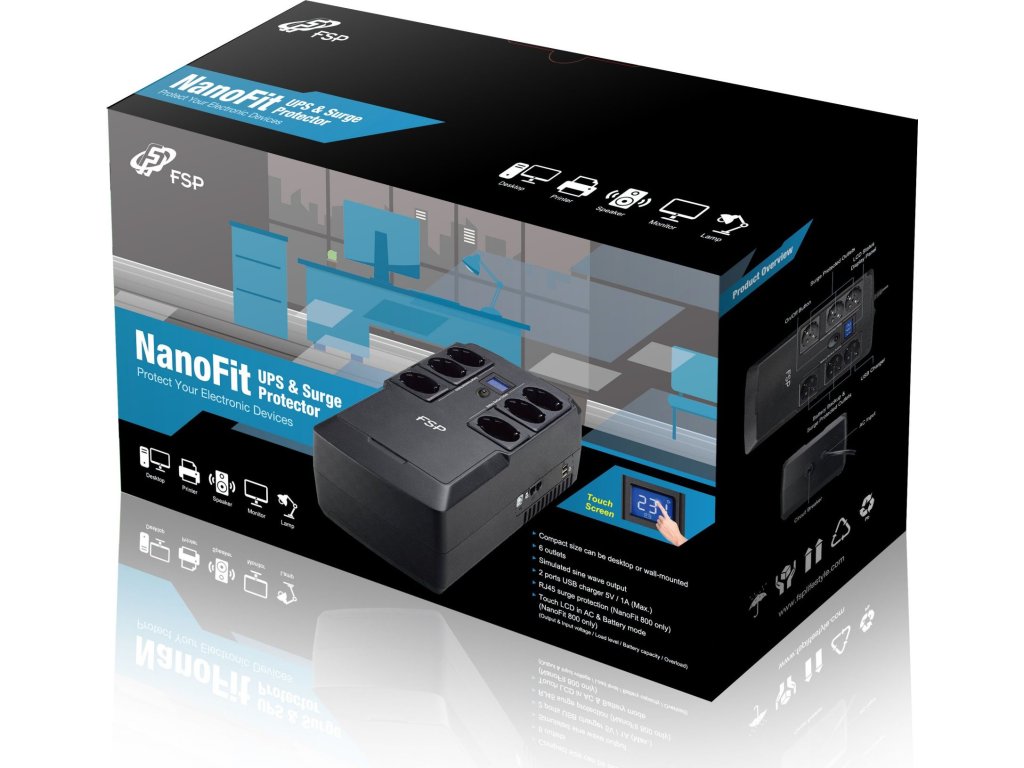 UPS NanoFit je kompaktní zařízení poskytující vynikající ochranu zařízení proti přepětí a špičkám. NanoFit bude v případě výpadku elektřiny poskytovat stabilní napájení, které vám umožní bezpečně vypnout připojené PC. Jeho zabudované mikroprocesorové řízení garantuje vysokou spolehlivost. Tato UPS je ideální pro použití v malých kancelářích a domácnostech. UPS lze upevnit také na stěnu.