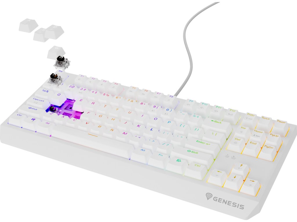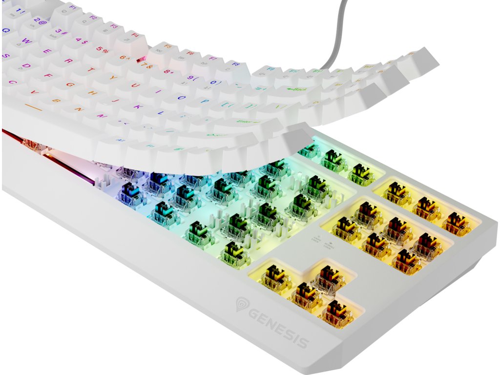 Klávesnici Genesis Thor 230 TKL jsme vybavili lineárními spínači Outemu Brown, které vynikají vysokou přesností, aktivací bez ohledu na místo stisknutí klávesy a vysokou dynamikou. Víme však, že jako hráč můžete mít své vlastní preference. Proto jsme do Genesis Thor 230 TKL implementovali Hot Swap - techniku, která vám umožní nahradit jakýkoli třípinový mechanismus mikrospínačem od společností jako Outemu, Akko, KTT. Jednoduše vytáhněte nainstalovaný mechanismus a zapojte nový. Díky systému Hot Swap také nemusíte kupovat novou klávesnici, když jeden spínač selže. Vyměníte jej během několika sekund. Je to jednoduché.
