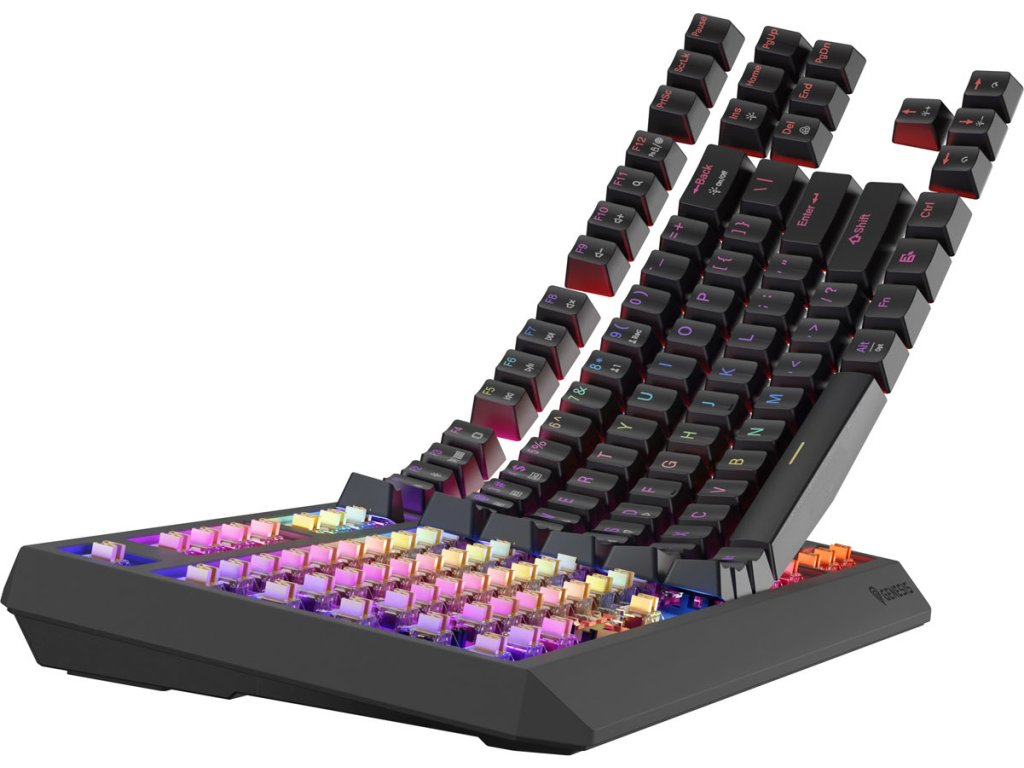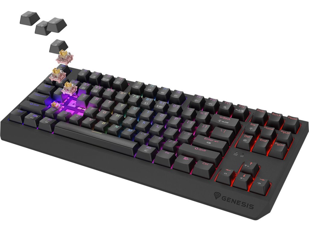 Klávesnice GENESIS Thor 230 TKL Wireless je vybavena různými typy spínačů. Každý z nich se vyznačuje vysokou přesností, aktivací bez ohledu na místo stisknutí klávesy a vysokou dynamikou. Víme však, že jako hráč můžete mít své vlastní preference. Proto jsme v GENESIS Thor 230 TKL Wireless implementovali hot - swap - techniku, která vám umožní vyměnit jakýkoli třípinový mechanismus za mikrospínač od společností jako Outemu, Akko, KTT. Jednoduše vytáhněte nainstalovaný mechanismus a zapojte nový. Díky systému Hot Swap také nemusíte kupovat novou klávesnici, když jeden spínač selže. Můžete jej vyměnit během několika sekund.