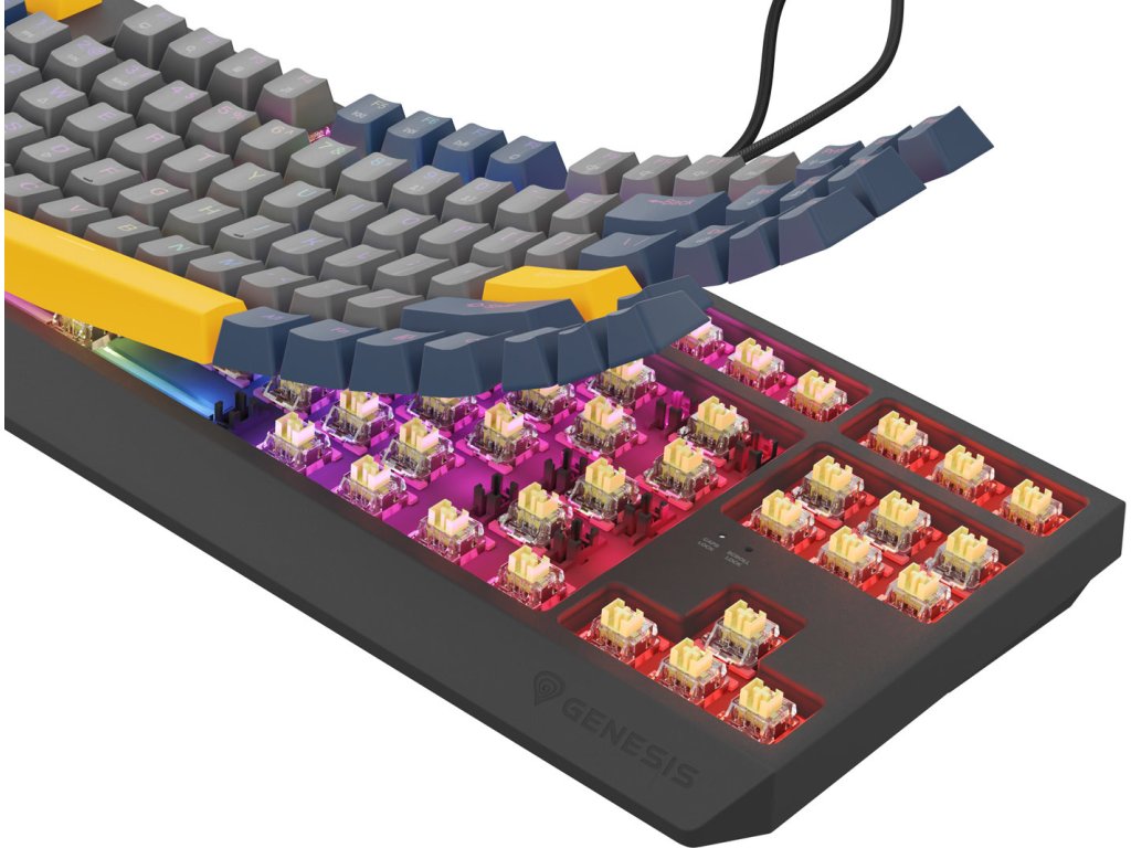 Klávesnici Genesis Thor 230 TKL jsme vybavili lineárními spínači Outemu Red, které vynikají vysokou přesností, aktivací bez ohledu na místo stisknutí klávesy a vysokou dynamikou. Víme však, že jako hráč můžete mít své vlastní preference. Proto jsme do Genesis Thor 230 TKL implementovali Hot Swap - techniku, která vám umožní nahradit jakýkoli třípinový mechanismus mikrospínačem od společností jako Outemu, Akko, KTT. Jednoduše vytáhněte nainstalovaný mechanismus a zapojte nový. Díky systému Hot Swap také nemusíte kupovat novou klávesnici, když jeden spínač selže. Vyměníte jej během několika sekund. Je to tak jednoduché.