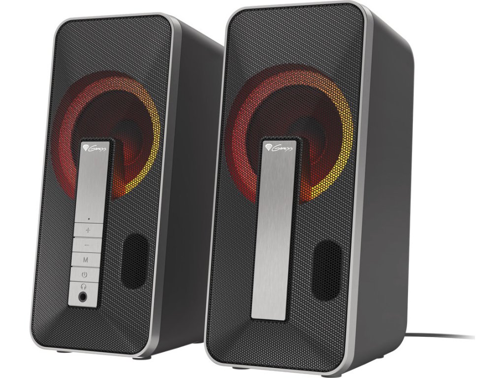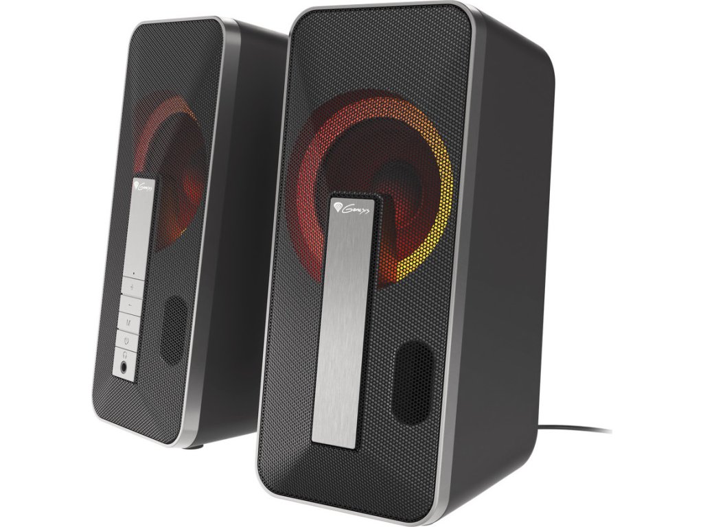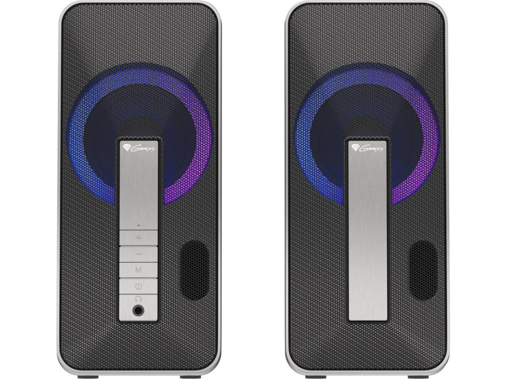 To, co tyto reproduktory odlišuje, je jedinečný design v kombinaci s okouzlujícím efektem RGB podsvícení. Díky kombinaci černého matného krytu se stříbrným kartáčovaným předním panelem budou reproduktory vypadat skvěle na každém herním stole.
