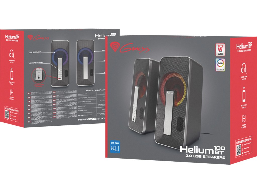 Genesis Helium 100 BT jsou reproduktory navržené s ohledem na potřeby hráče. Díky kompaktní velikosti nezabírají mnoho místa na stole a díky nejnovějším technologiím dosahují krásný, pohlcující zvuk prostor osvětlený miliony barev. S Helium 100BT se budete hrou naprosto pohlceni.