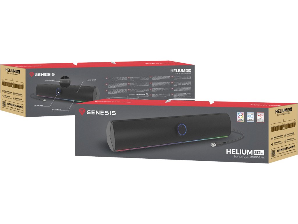Se soundbarem GENESIS Helium 312 BT se nejen ponoříte do své oblíbené hudby, ale také rozsvítíte svůj herní koutek. Díky klasickému barevnému provedení a designu snadno dotvoříte skvělou jak herní, tak poslechovou atmosféru. Umožní vám to i RGB podsvícení, které můžete v případě potřeby snadno vypnout.
