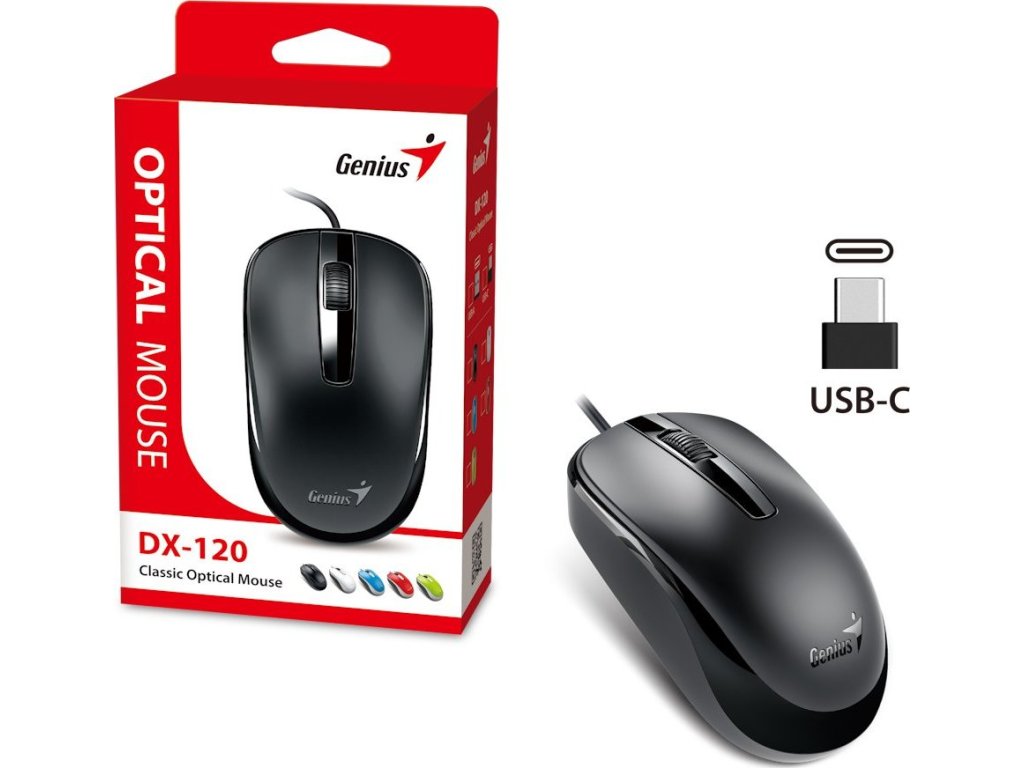 Optická myš Genius DX-120 pro každodenní činnost s počítačovými aplikacemi a ovládání PC či notebooku. Díky rozlišení senzoru 1200 DPI je manipulace s myší svižná a přesná. Rychlá kontrola všech programů vám umožní standardní činnost a optimální pracovní nasazení, ať už zpracováváte tabulkami, grafy nebo texty. Standardní rozvržení tlačítek a posuvného kolečka je navrženo pro váš komfort a efektivní ovládání, včetně třeba surfování po internetu. Symetrické provedení umožňuje pohodlné uchopení levou i pravou rukou a díky USB-C rozhraní myš Genius DX-120 snadno připojíte k modernímu PC nebo notebooku a ihned se můžete pustit do práce.