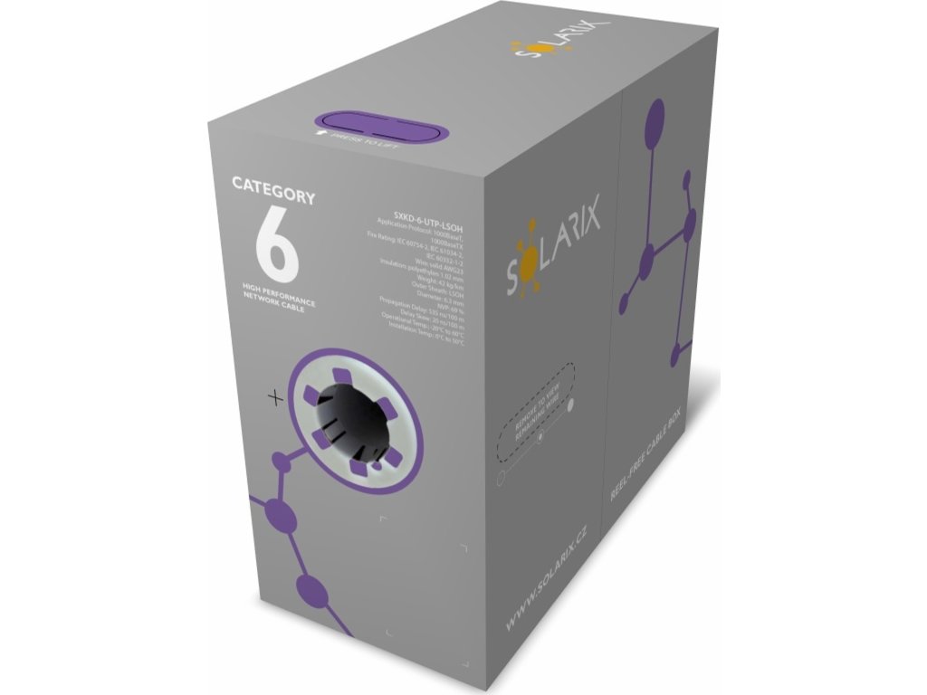 Instalační kabel Solarix s označením SXKD-6-UTP-LSOH je spolehlivý nestíněný kabel kategorie 6, který je testován až do šířky pásma 450 MHz, a je určený pro provoz ethernetových protokolů, včetně 2.5GBASE-T a 5GBASE-T. Konstrukce kabelu je U/UTP s plastovým křížem, který zajišťuje maximální oddělení párů od sebe po celé délce kabelu. Typ pláště je LSOH s třídou reakce na oheň Dca-s2,d2,a1. Vodiče kabelu jsou vyrobeny z kvalitního měděného drátu s čistotou mědi 99,97 %. Kabel bez problémů splňuje požadavky z mezinárodních standardů ISO/IEC 11801, EN 50173 a ANSI/TIA 568.2-D. Výkonové parametry tohoto kabelu byly otestovány nezávislou testovací zkušebnou FORCE TECHNOLOGY v rámci programu EC Verified, a to na nejvyšší úroveň tzv. Component Level. Certifikát je k dispozici zde na webu v záložce "Odkazy" nebo přímo na stránkách laboratoře FORCE. V případě CPR (nařízení EU č. 305/2011) je kabel testován v systému posuzování vlastností AVCP 3. Stejně jako ostatní kabely Solarix, je i kabel SXKD-6-UTP-LSOH značen metráží po 1 m v rozsahu od 0 do 305 m. Kabel je dodáván ve vysoce odolném třívrstvém leštěném kartónovém boxu, na kterém jsou uvedeny všechny nezbytné produktové informace, včetně čárových kódů, výrobní šarže, popisu a nejdůležitějších technických parametrů.