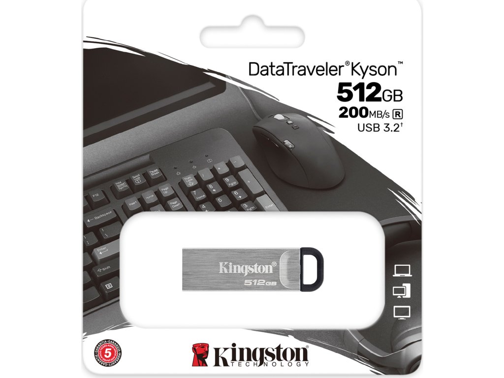 Připojení flash disku Kingston DataTraveler KYSON je zajištěno skrze rozhraní USB 3.2 Gen1, které podporuje rychlý přenos dat a svižné zálohování souborů. Pro data je k dispozici obří 512GB úložiště. Praktické poutko vám umožní flash disk upevnit na klíče.