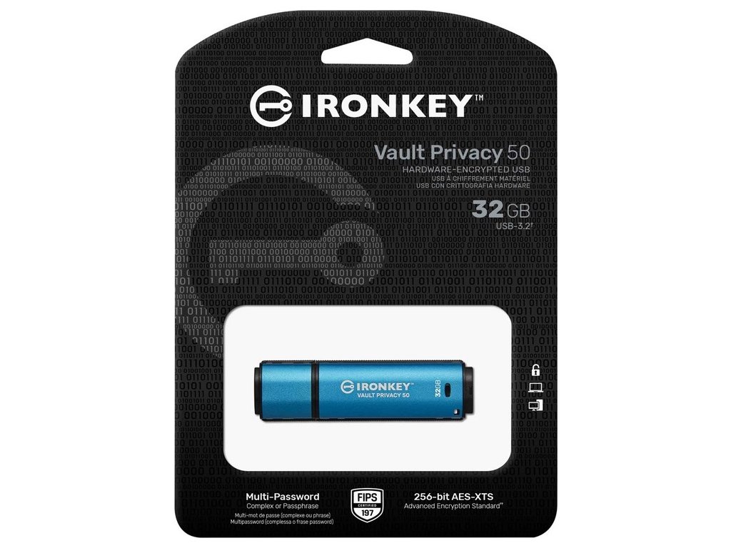 Kingston IronKey™ Vault Privacy řady 50C jsou špičkové disky USB Type-C®, které zajišťují zabezpečení Enterprise-Grade úrovně pomocí 256bitového hardwarového šifrování AES s certifikací FIPS 197 v režimu XTS, včetně zabezpečení proti BadUSB pomocí digitálně podepsaného firmwaru a ochrany proti útoku na heslo hrubou silou. Na VP50 byly provedeny zkoušky prolomení pro zabezpečení na Enterprise-Grade úrovni Vzhledem k tomu, že se jedná o šifrované úložiště pod fyzickou kontrolou uživatele, je řada VP50 při ochraně dat lepší než používání internetu a cloudových služeb.