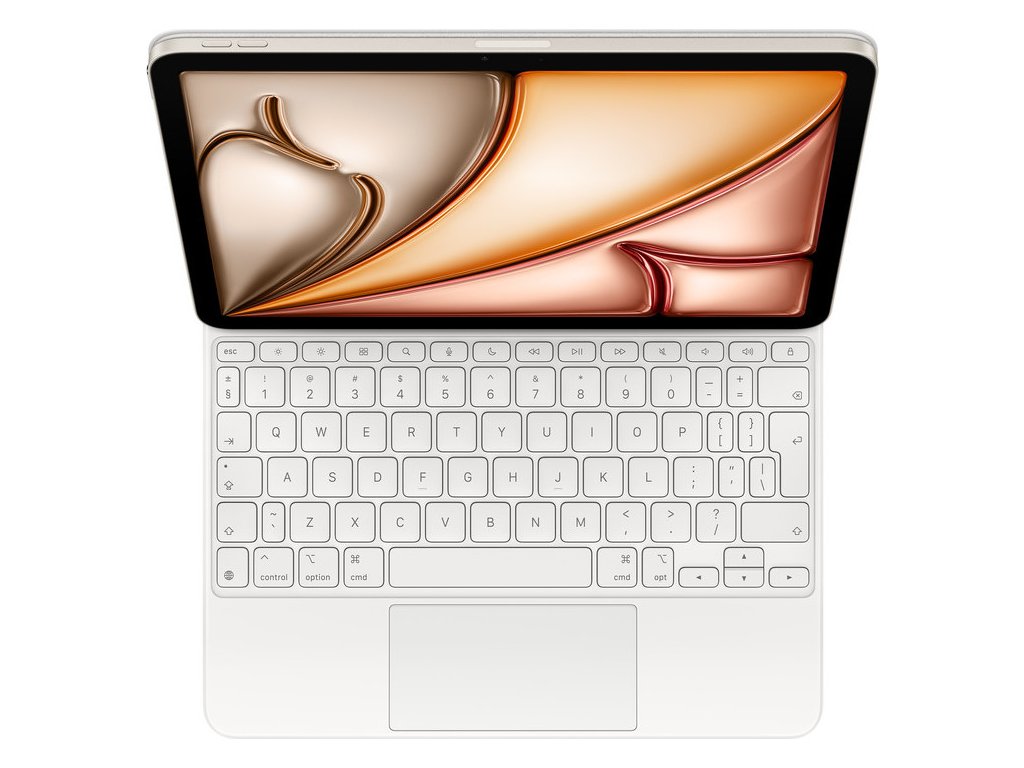 Magic Keyboard je ideální doplněk k iPadu Air. Má elegantní a přenosný design a je na něm radost psát i používat trackpad na přesné ovládání. Nechybí mu řádek 14 funkčních kláves ani USB-C konektor na průchozí nabíjení. Navíc chrání iPad zepředu i zezadu. Plovoucí konzolová konstrukce se dá plynule přizpůsobit do různých pozorovacích úhlů a velký skleněný trackpad rozšiřuje možnosti práce s iPadOS.