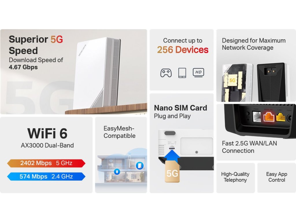 Díky kapacitě připojení až pro 256 zařízení současně se router hodí do domácností i menších firem. Port WAN/LAN s rychlostí 2,5 Gb/s umožňuje flexibilní přístup k internetu i bez 5G připojení. Kompatibilita s EasyMesh technologií zajišťuje bezproblémové propojení s dalšími kompatibilními routery a extendery, čímž se eliminuje přerušení signálu při pohybu po domě. Telefonní port s podporou VoLTE umožňuje kvalitní volání a současné využívání internetu.