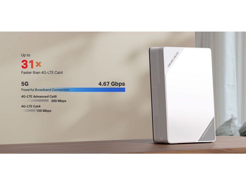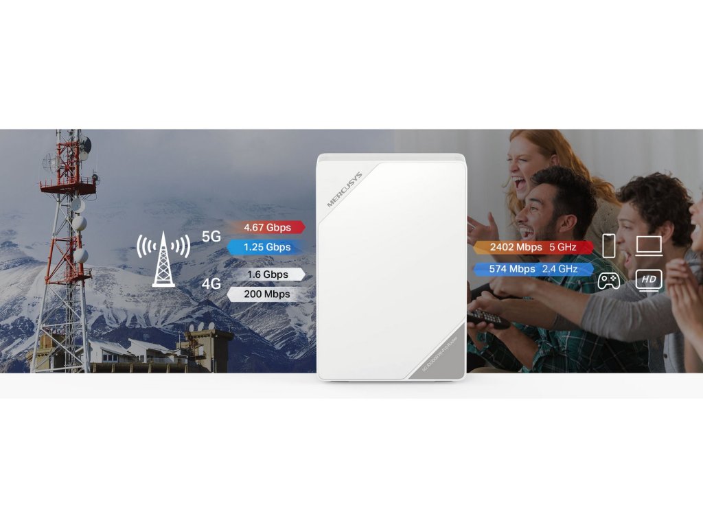 Výkonný dvoupásmový router s podporou 5G technologie přináší ultra rychlé stahování až 4,67 Gb/s a umožňuje snadno převést mobilní síť na stabilní Wi-Fi připojení. Podpora standardu Wi-Fi 6 poskytuje rychlost až 2402 Mb/s v pásmu 5 GHz a 574 Mb/s v pásmu 2,4 GHz, což zajišťuje plynulé streamování, hraní her i práci z domova. Stačí vložit SIM kartu a ihned využívat připojení, bez nutnosti složité konfigurace. Pokročilé interní antény a možnost připojení externích zajišťují maximální pokrytí, a to i ve větších objektech.