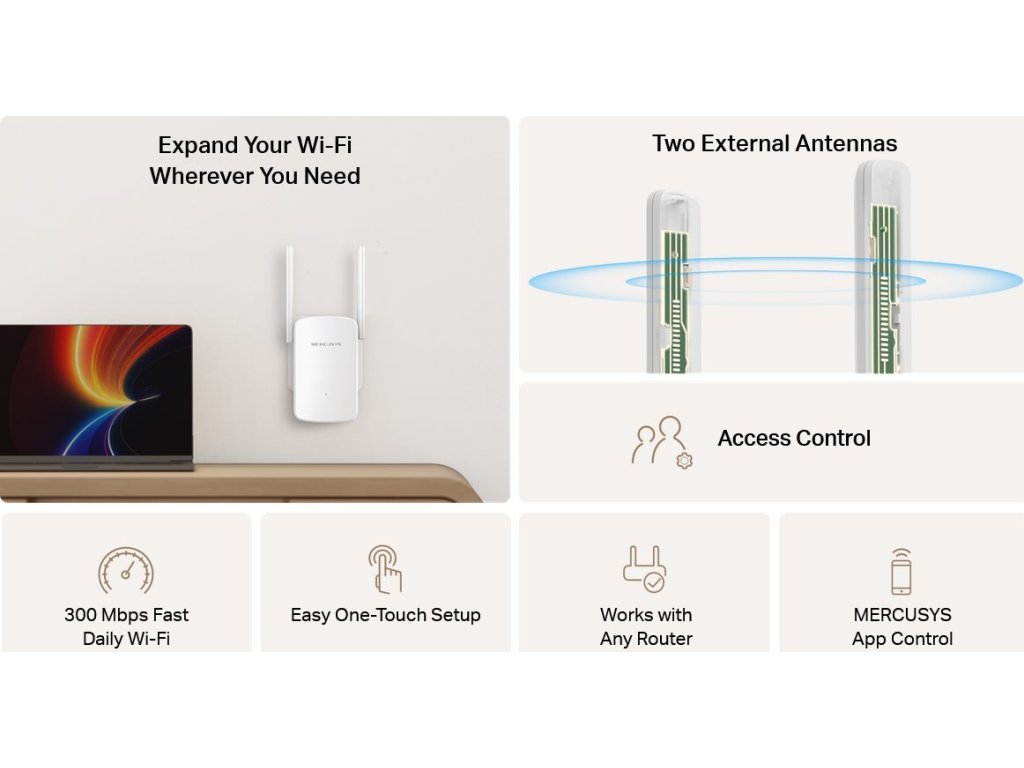 * Užijte si rychlé a stabilní rozšířené Wi-Fi až do rychlosti 300 Mbps, ideální pro běžné denní použití.