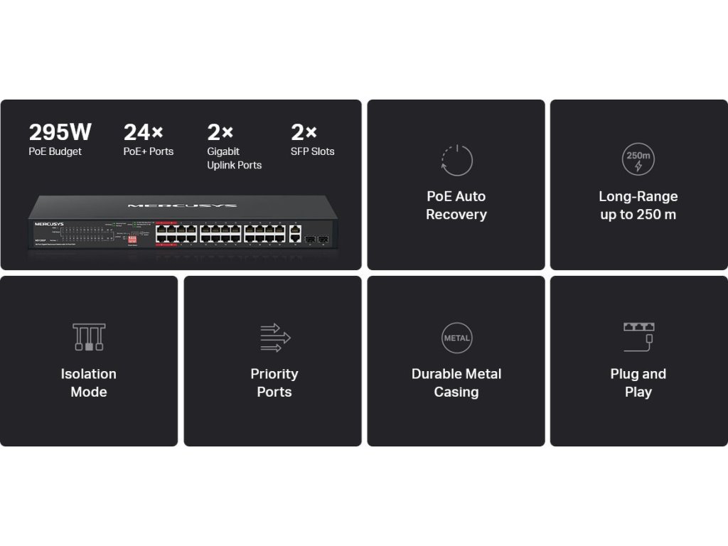*PoE Budget: 250 W (celkový výkon pro napájená zařízení)