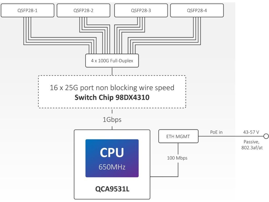 - Qualcomm QCA9531 650 MHz, Marvell Prestera (98DX4310), 64 MB RAM, 16 MB Flash