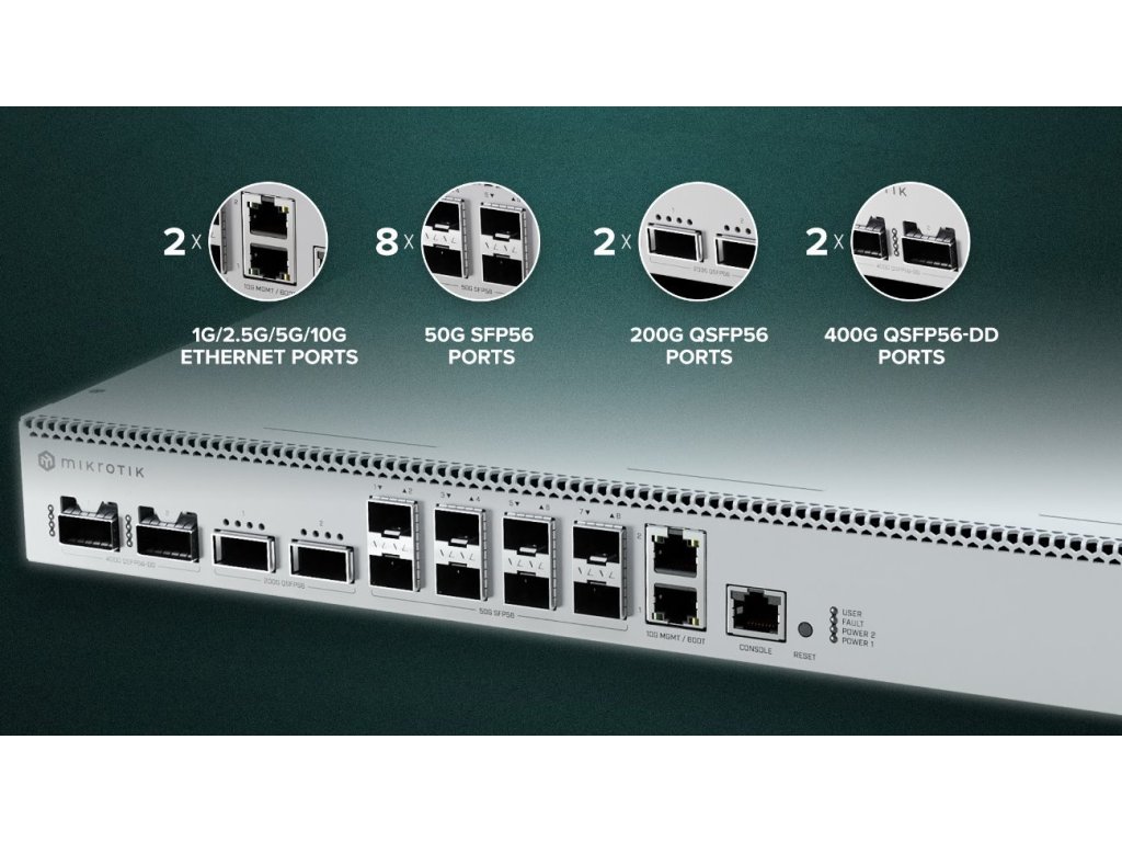 MikroTik Cloud Switch CRS812-8DS-2DQ-2DDQ-RM, 4x 2GHz CPU, 2x SFP+, 8x SFP56, 2x QSFP56, 2x QSFP56-DD, 2x PSU, L6