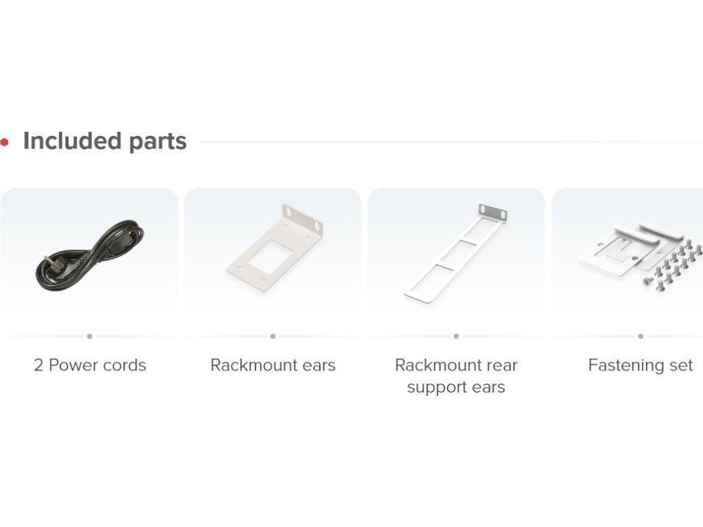 V balení naleznete 2× napájecí kabely, rackmount konzole, zadní podpory a kompletní montážní sadu pro instalaci do 19" racku.