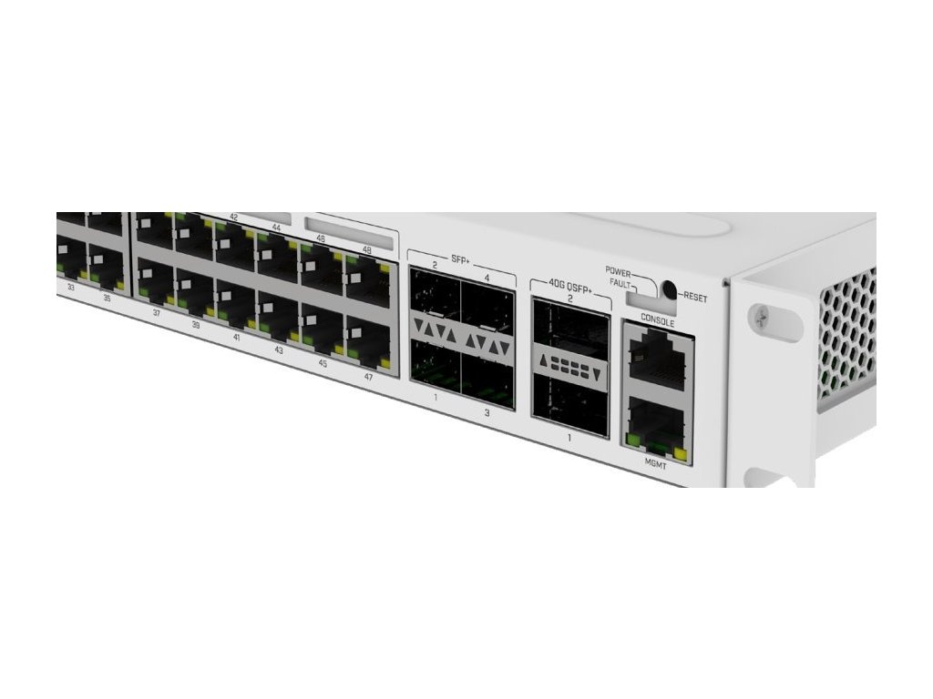 PoE+ CRS switch s 48x Gbps LAN, 4x 10 Gbps SFP+, 2x 40 Gbps QSFP+ a dvěma RJ45 porty (management a konzole) v rack provedení.