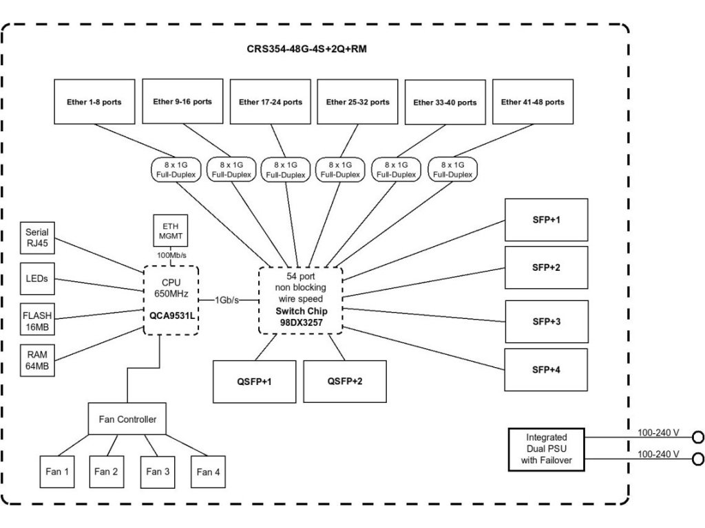 Předností je PoE+ napájení na všech 48 portech a operační systém RouterOS (Licence level 5).