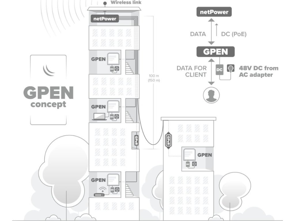 MikroTik GPEN21GPEN21 je Smart PoE injektor, který je určený pro napájení zařízení, např. domácího Wi-Fi routeru a venkovní antény. K injektoru je možné připojit zdroj v rozmezí napájení 12-57 V.