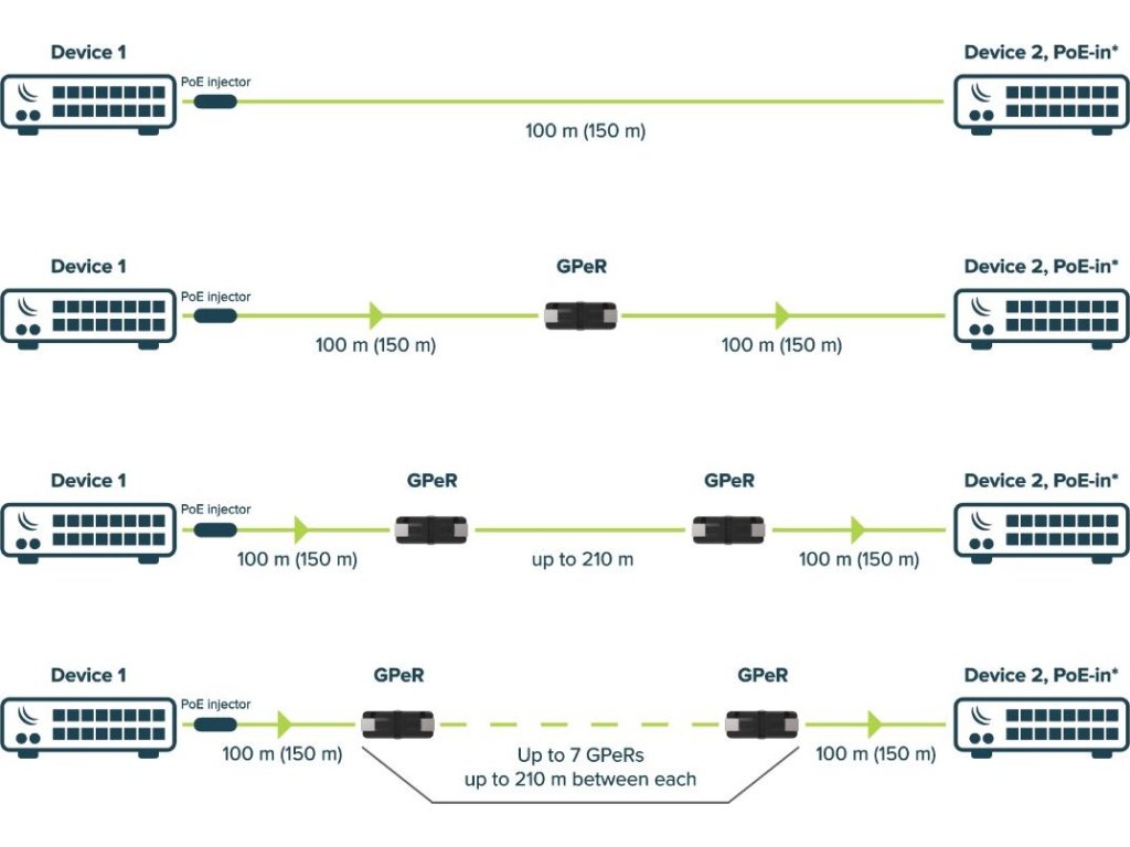 Opakovač umožňuje rozšíření dosahu Ethernet sítě o další skok (až <100-150m standardní sítě, až 210m při nasazení další GPeR jednotky) až na 1500m.