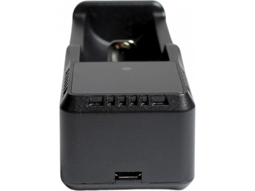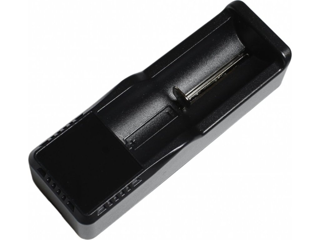 Lithium-iontová nabíjačka s jedným nabíjacím slotom. Vďaka pohyblivému zadnému kontaktu umožňuje nabíjanie batérií v širokom rozsahu dĺžok.