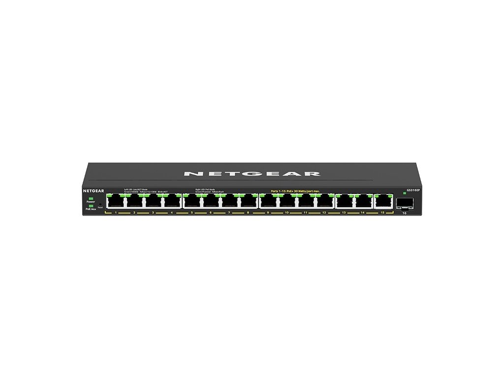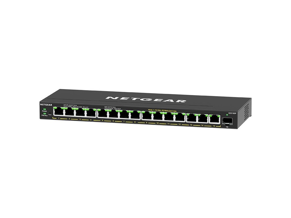Netgear GS316EP 16portový přepínač PoE+ Gigabit Ethernet Plus (180 W) s 1 portem SFP. NETGEAR 16-portový switch PoE+ Gigabit Ethernet Plus poskytuje základní funkce podnikové sítě a napájí zařízení PoE+, jako jsou telefony VoIP, IP kamery a další.