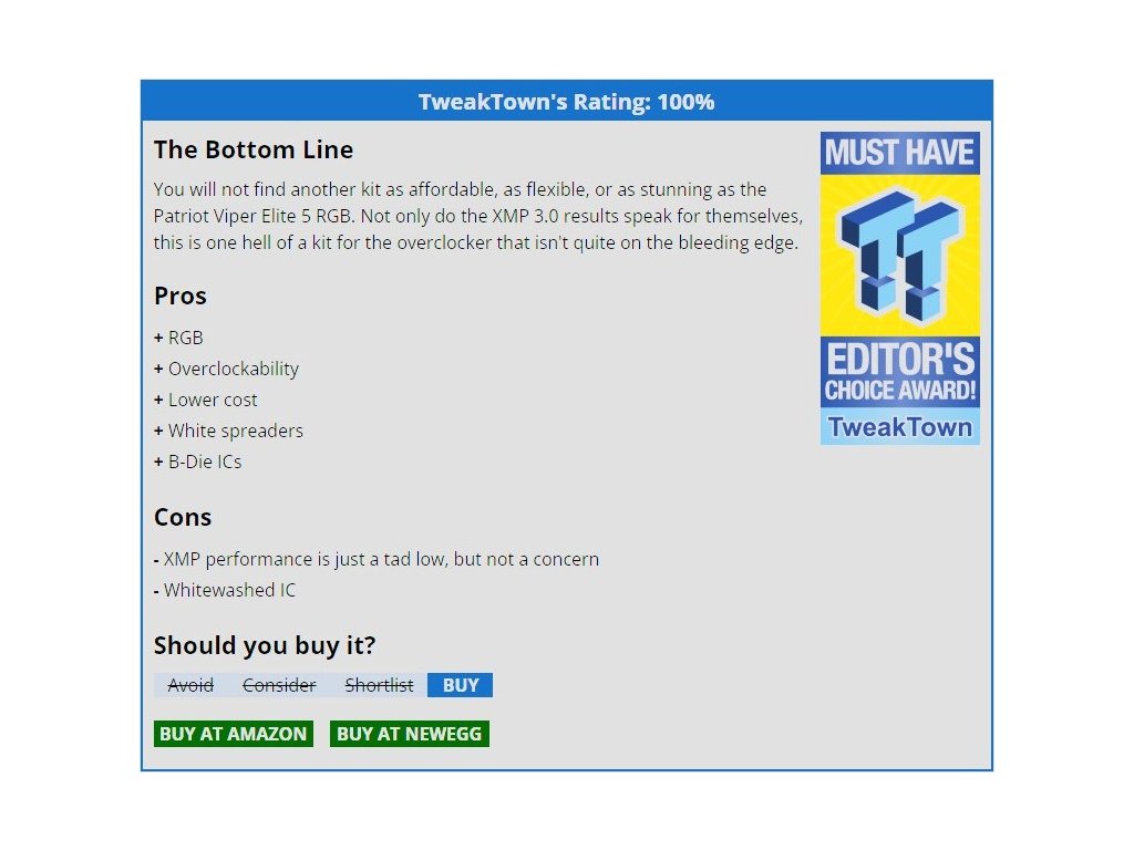 Tento kit Patriot Viper Elite 5 White DDR5 32 GB 7000 MT/s (2× 16 GB) získal ocenění: