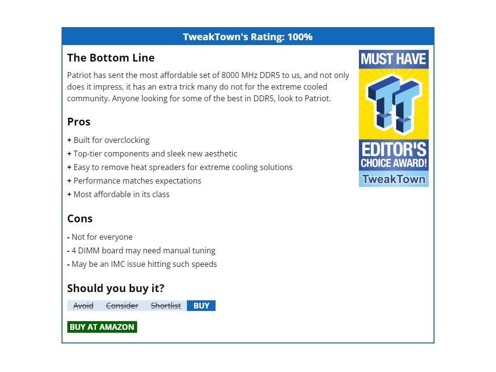 Tento kit Patriot Viper Xtreme 5 RGB 32 GB 8000 MT/s (2× 16 GB) získal ocenění: