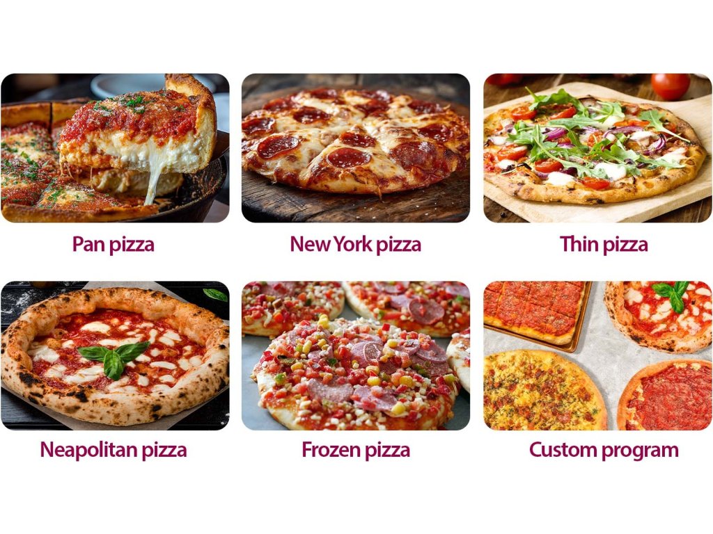 • New York pizza: Větší, měkčí plátky s pružným těstem, které se dá snadno složit napůl. Program kombinuje středně vysokou teplotu a delší pečení, díky čemuž vznikne zlatavý, ale stále vláčný základ – ideální pro sýrové a výrazné americké pizzy.