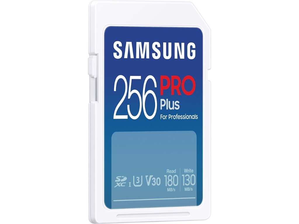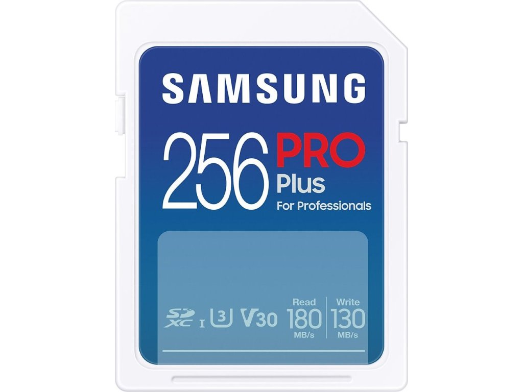 Samsung PRO Plus SDXC 256 GBRychlá paměťová karta formátu SDXC pro profesionální použití v dronech, akčních kamerách, 360° kamerách či tabletech nabízí kapacitu 256 GB. Rychlost čtení je až 180 MB/s. Samozřejmostí je pak zvýšená odolnost vůči vodě, nárazům a pádům z výšky, extrémním teplotám, opotřebení, magnetům i rentgenovému záření.