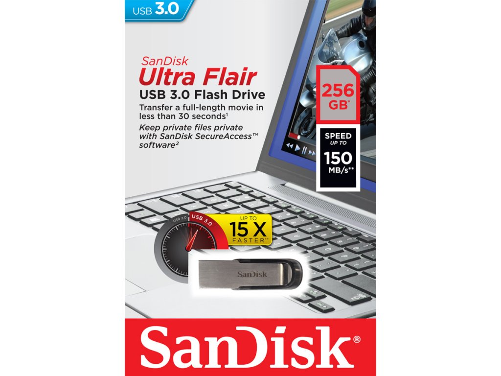 SanDisk Ultra Flair USB™ 3.0 flash disk zajišťuje rychlé přesuny Vašich dat mezi jednotlivými médii, tím zkrátí Vaše čekání. Díky USB 3.0 přenese Vaše data rychleji než standardní USB 2.0. Stylový elegantní kovový design je navržen tak, aby byl dostatečně pevný a odolával nárazům. Umožňuje nastavitelnou ochranu heslem, takže si můžete být jistí, že Vaše data zůstanou soukromá a viditelná je pro Vámi zvolené osoby.