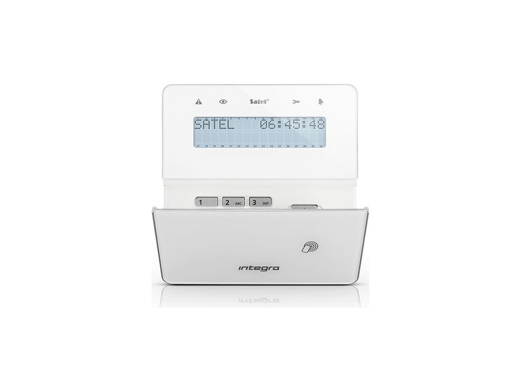 Bezdrôtová LCD klávesnica s RFID čítačkou pre systém INTEGRA (ABAX 868 MHz), (biela-strieborná-biela), obojsmerná šifrovaná rádiová komunikácia vo frekvenčnom pásme 868 MHz, dosah do 800 m na voľnom priestranstve s ACU-120 / 400 m s ACU-270, biele podsvietenie, frekvencia čítačky 125 kHz, formát kariet UNIQUE, EM4001, EM4002, EM4003, EM4102, LED diódy indikujú stav systému, rýchle zapnutie režimu stráženia, klávesy pre napadnutie-požiar-pomoc, lítiové batérie 2x CR123A 3 V, rozmery 145 x 143 x 25 mm