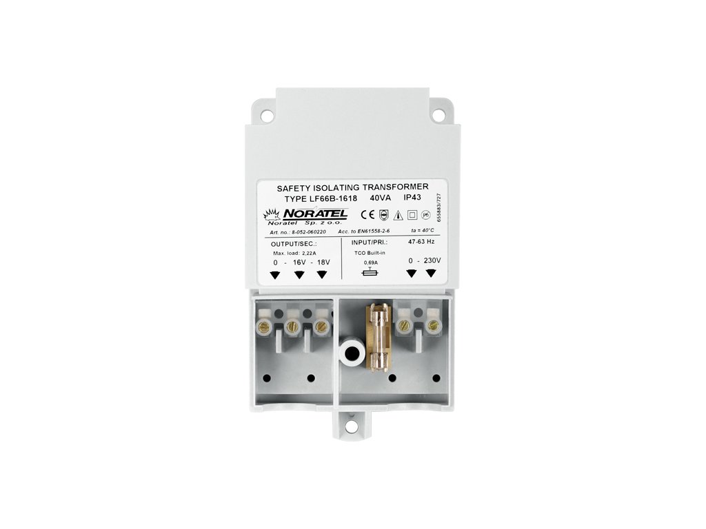 Transformátor 230 V/16,18 AC, 40 VA, teplotná poistka 130°C, topiková poistka 0,315 A, pre Satel/Paradox ústredne