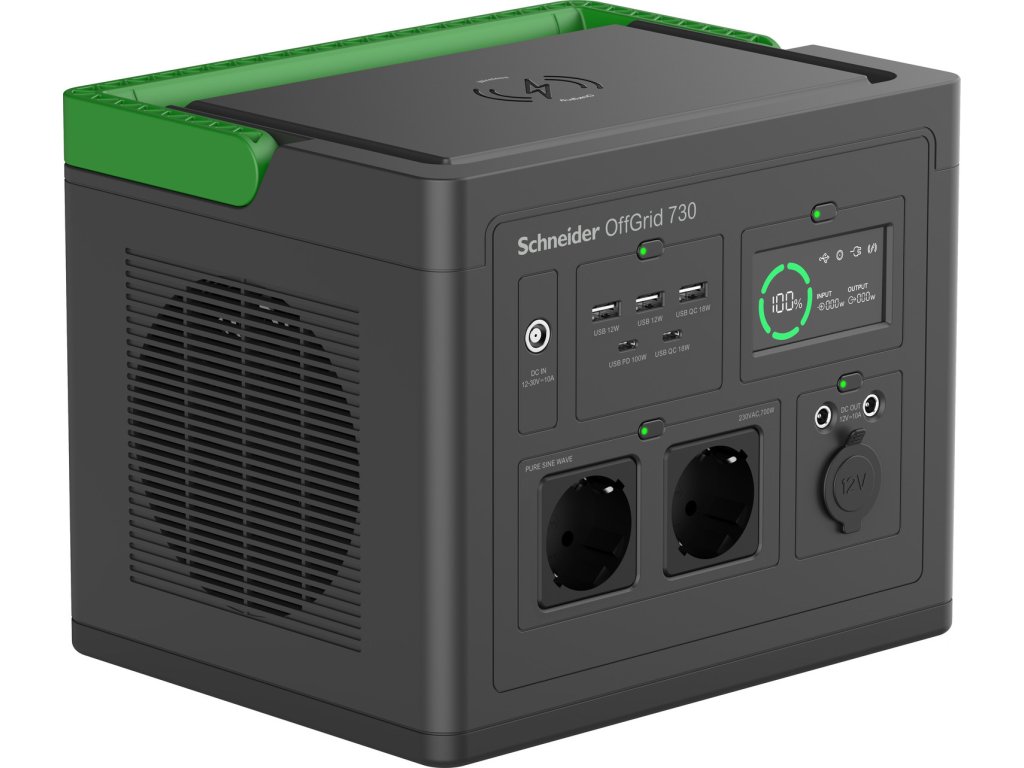 Schneider OffGrid Portable Power Station 730. Přenosná napájecí stanice s čistou sinusovkou, ideální pro kempování, karavan nebo mobilní bezdrátové nabíjení.