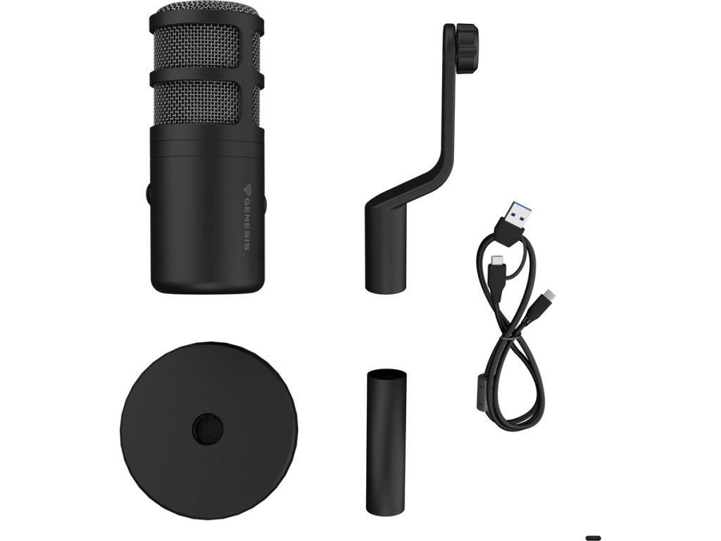 Mikrofon GENESIS Radium 350D je připraven k provozu chvíli po vybalení z krabice. Stačí ho jen položit na stůl a poté připojit k počítači pomocí kabelu USB-C (s adaptérem USB-A). V případě potřeby můžete zvýšit výšku stativu pomocí přiloženého prodlužovacího kabelu. Nic vám také nebrání připojit stativ GENESIS Radium 350D k mikrofonnímu rameni pomocí standardního 5/8" závitu.