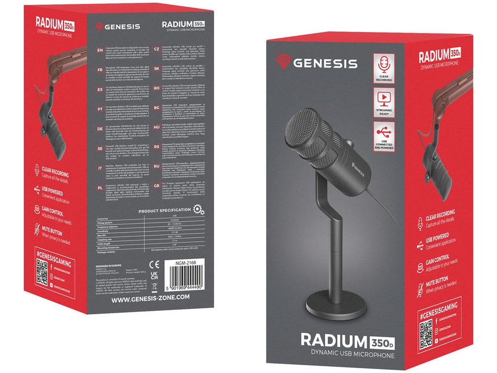GENESIS Radium 350D je první dynamický mikrofon z rodiny produktů Genesis. Je ideální pro uživatele, kterým záleží na velmi dobré kvalitě nahrávaného hlasu - ale nemají akusticky vhodnou místnost pro nahrávání. Zvuk přímo z profesionálních podcastů máte na dosah ruky - a to ve své místnosti.